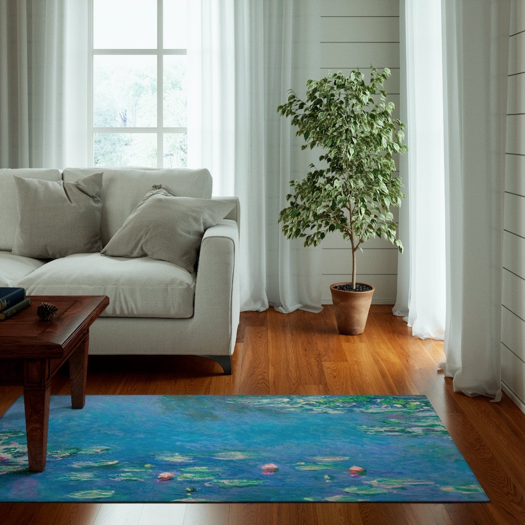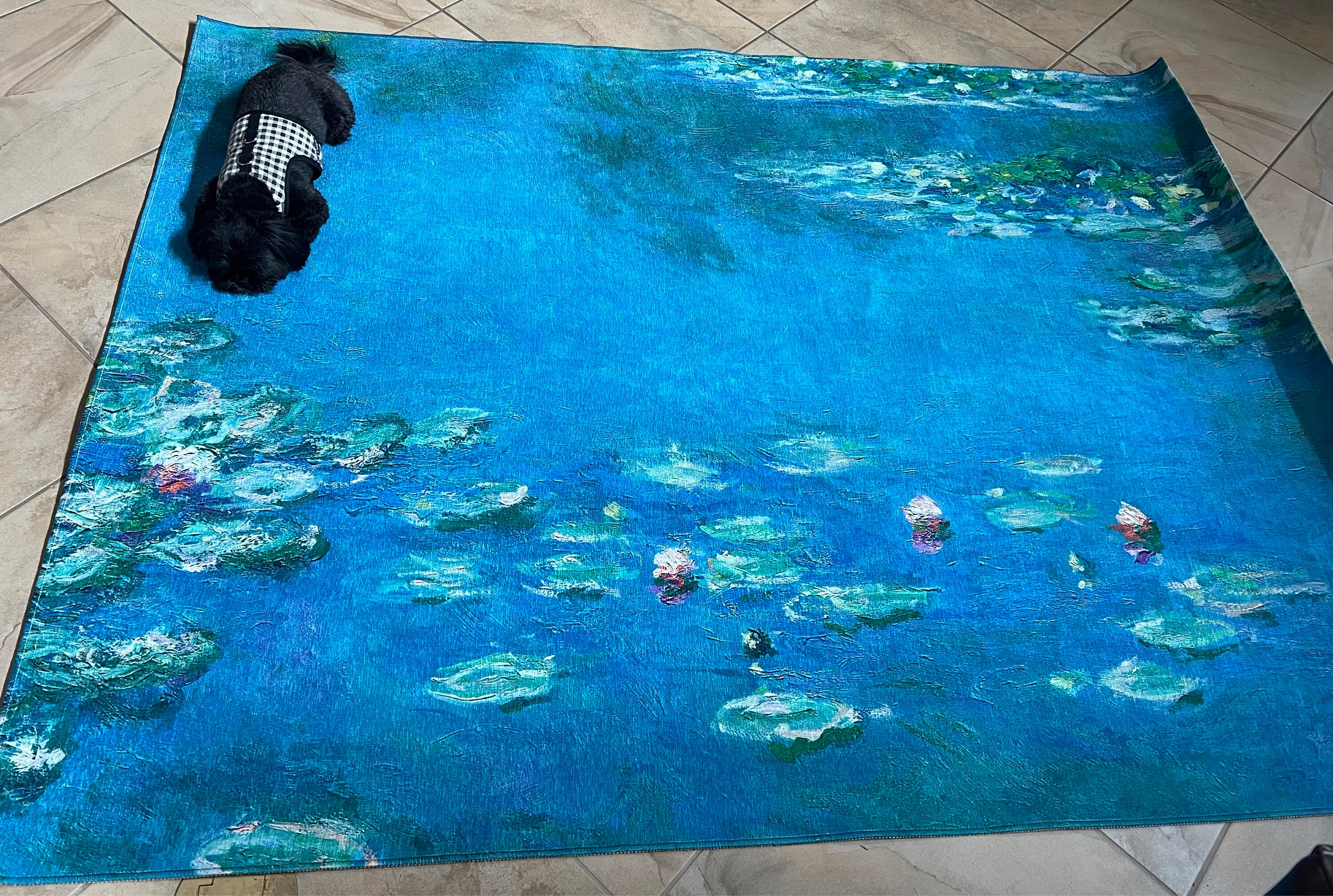 Can I just say WOW!! The Monet Waterlily rug is fabulous. It is just as beautiful as in the listing pics. I would definitely buy this again and will look for other rugs to buy from this seller. Very very happy with the colors and quality of the rug. I like the very low nap and the vibrant colors. It’s gorgeous.