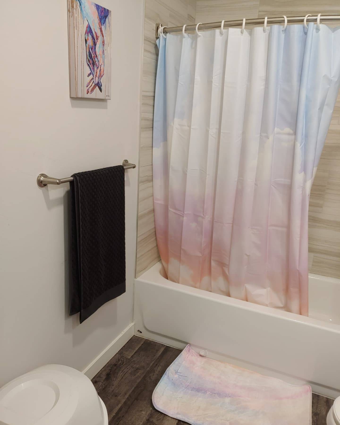 This soft non-slip bath mat is fuzzy, foamy & uniquely enhanced with a holographic (the material is NOT reflective, but is a screenprint of a holographic photo) rainbow pattern. Available in two sizes, this shower/bath mat adds a splash of nature to your bathroom decor.